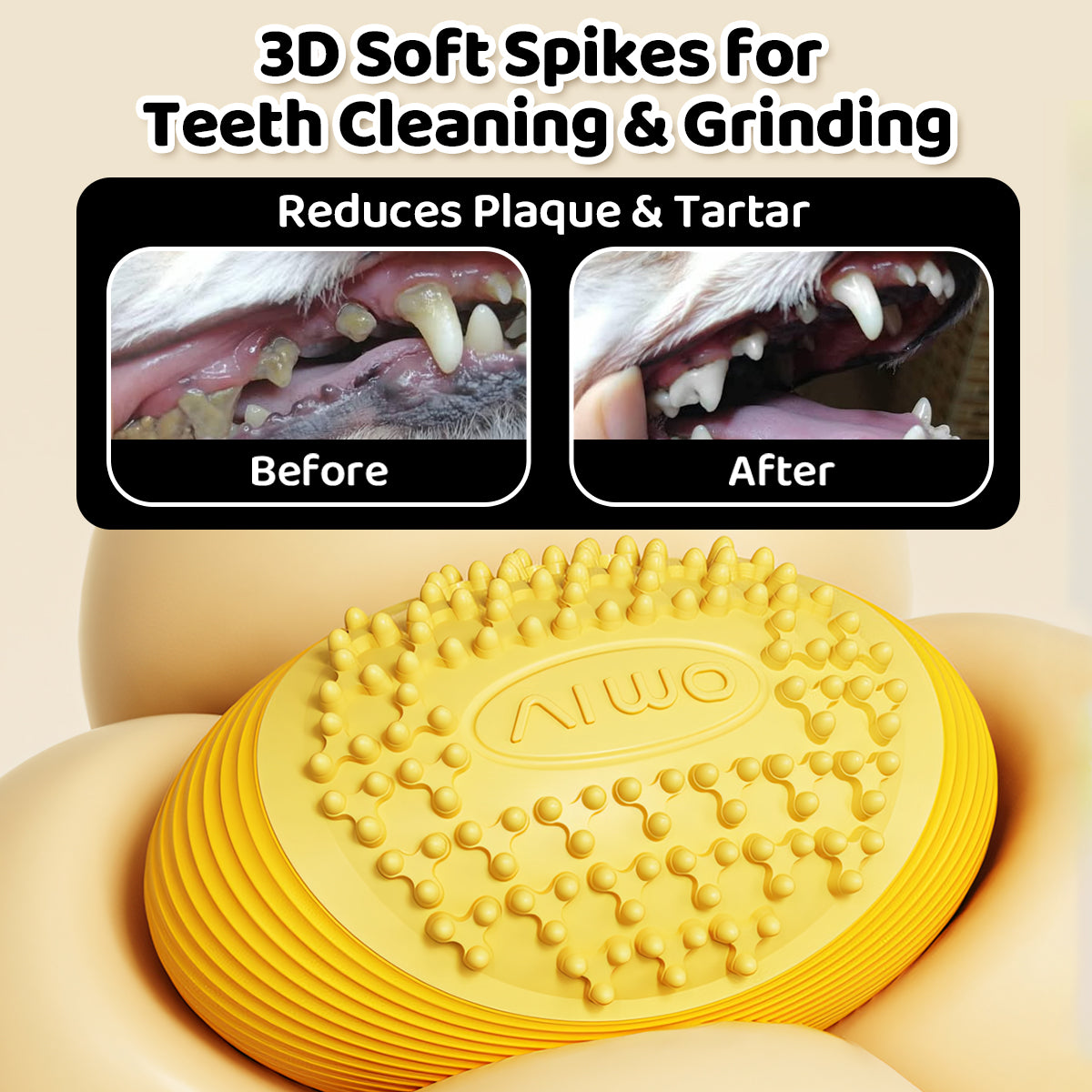 • 3D textured spikes help clean teeth and massage gums while chewing